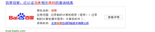 觸發(fā)機(jī)制:無(wú)論搜索任何關(guān)鍵詞,只要通過(guò)商標(biāo)認(rèn)證的網(wǎng)址,被檢索出現(xiàn)在百度搜索結(jié)果中,都會(huì)展現(xiàn)藍(lán)色?標(biāo)。