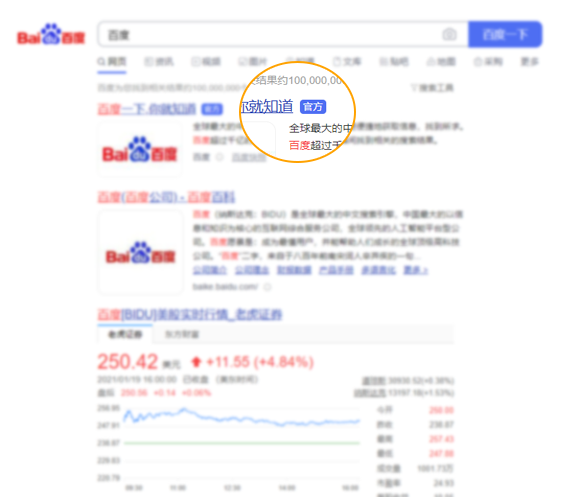 高級(jí)版觸發(fā)詞審核通過(guò)并生效后,當(dāng)網(wǎng)民精確搜索該觸發(fā)詞時(shí),若認(rèn)證通過(guò)的精確網(wǎng)址出現(xiàn)在搜索結(jié)果中,將為其展現(xiàn)藍(lán)色“官方”標(biāo)識(shí)。